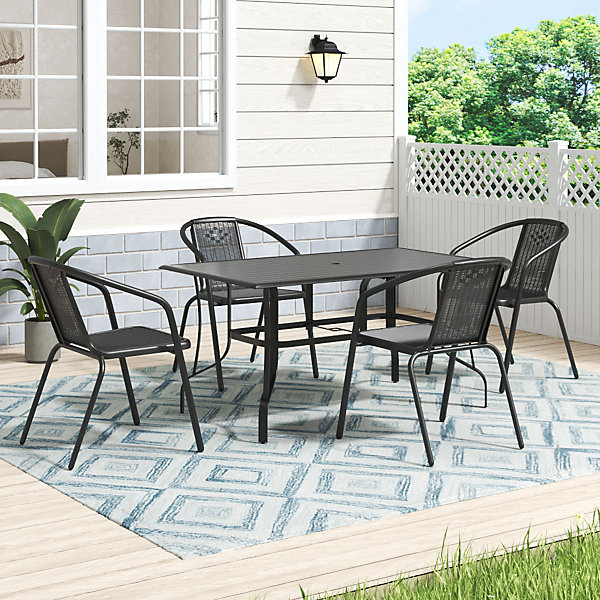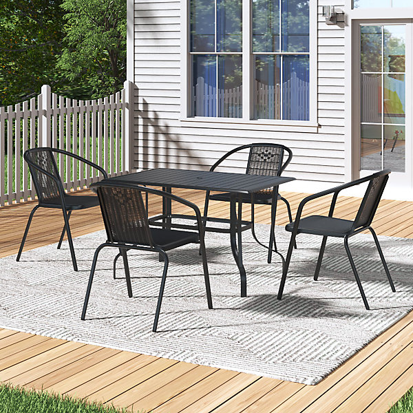 150cm L Garden Metal Slatted Coffee Table with Four Rattan Chairs Outdoor Table in Black